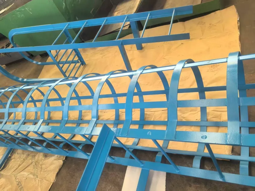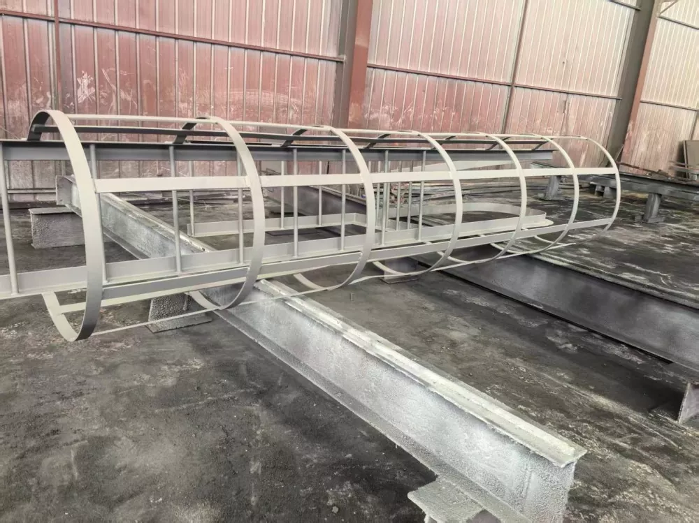 Montering av rekkverk: For trinn som overstiger 3 meter i høyden, må rekkverk monteres 2,5 meter over bakken. Rekkverkets diameter bør være mellom 700 mm og 800 mm. Horisontale ringer bør være laget av 16 mm rundstål, med en avstand mellom ringene på 300 mm til 450 mm. Vertikale armeringsjern skal være laget av 12 mm rundstål, med minst fire stenger jevnt fordelt. Sikkerhetsburet må installeres kontinuerlig til toppen av stigen eller hvileplattformen. Koblinger og fester